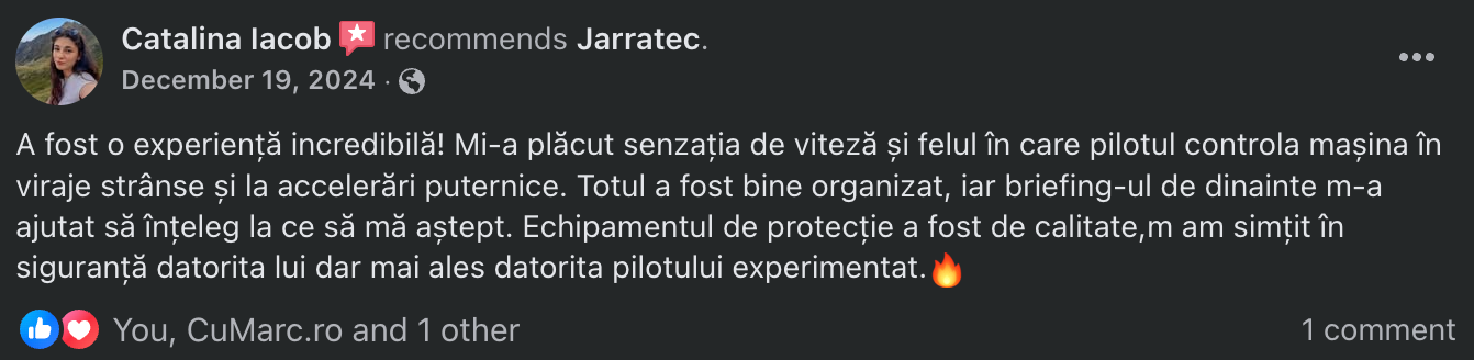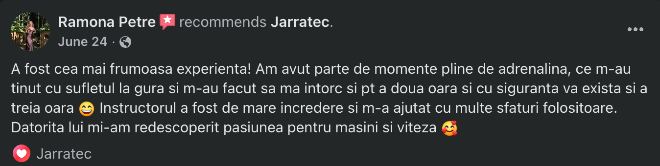 Experiența se va desfășura într-un mediu sigur, sub supravegherea unui fost vicecampion național la time-attack, aflat în dreapta ta.