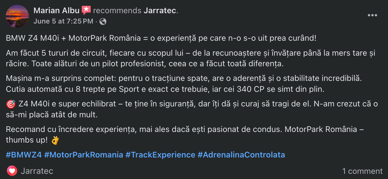 Experiența pe circuit include între 3 și 7 tururi, în funcție de pachetul ales.